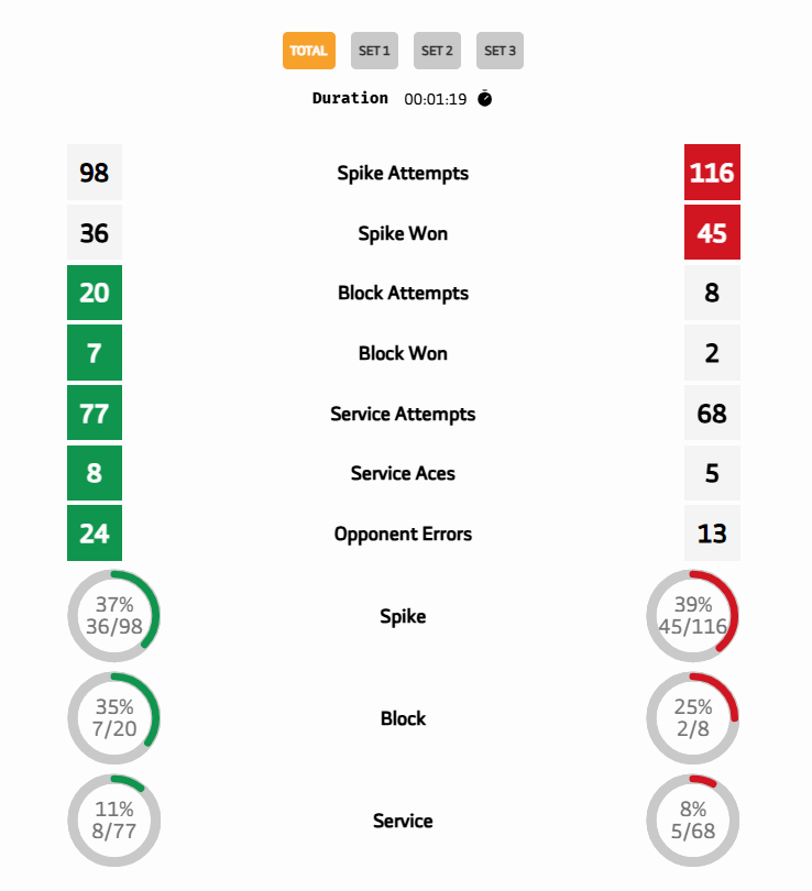 整场比赛,中国女排在进攻端累计扣球98次,成功命中36分,扣球成功率为37%。相比之下,中华台北队则在116次扣球中仅得45分,命中数略高,成功率为39%,可见对中国女排在防守端造成了不少压力。
